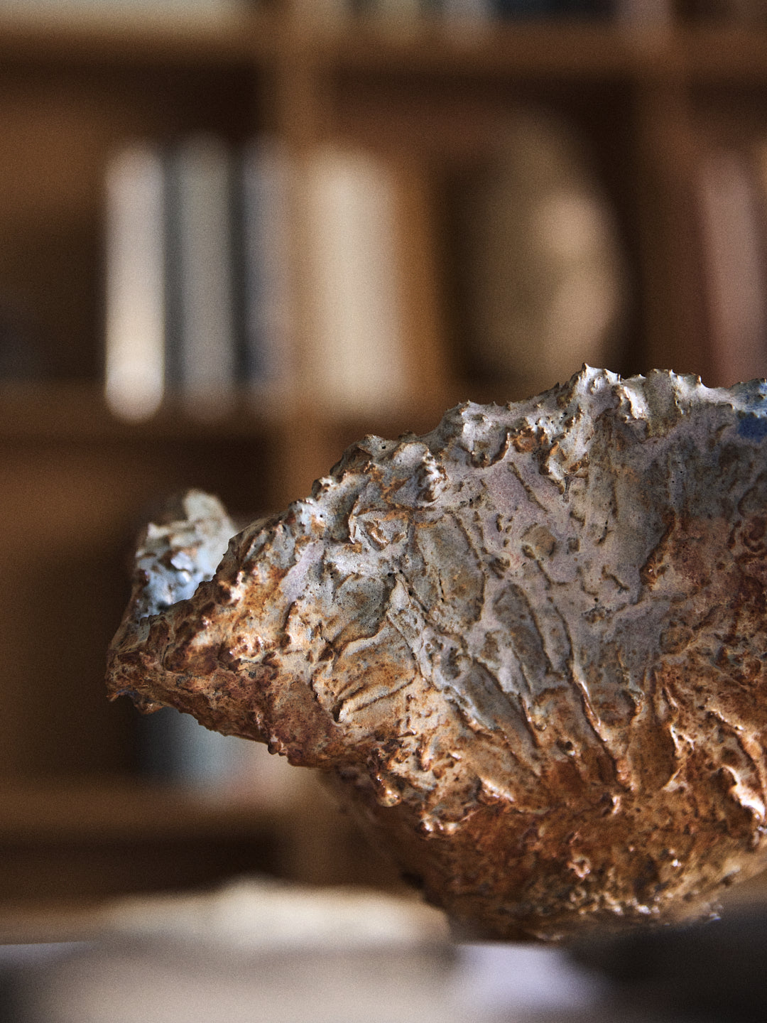 I am drawn to raw, dramatic structures — surfaces that capture the strength and intensity of the material itself. Working with oxides, clays, and natural substances, I allow the sands, grains, and minerals to remain present, unrefined, and full of energy.