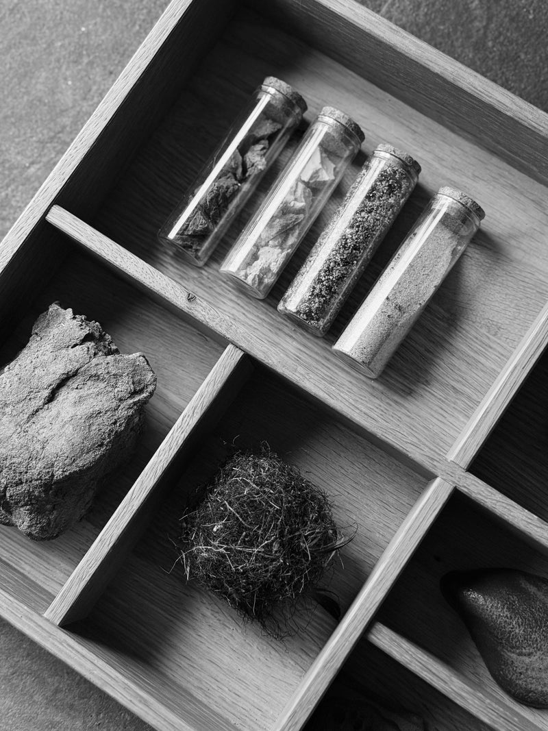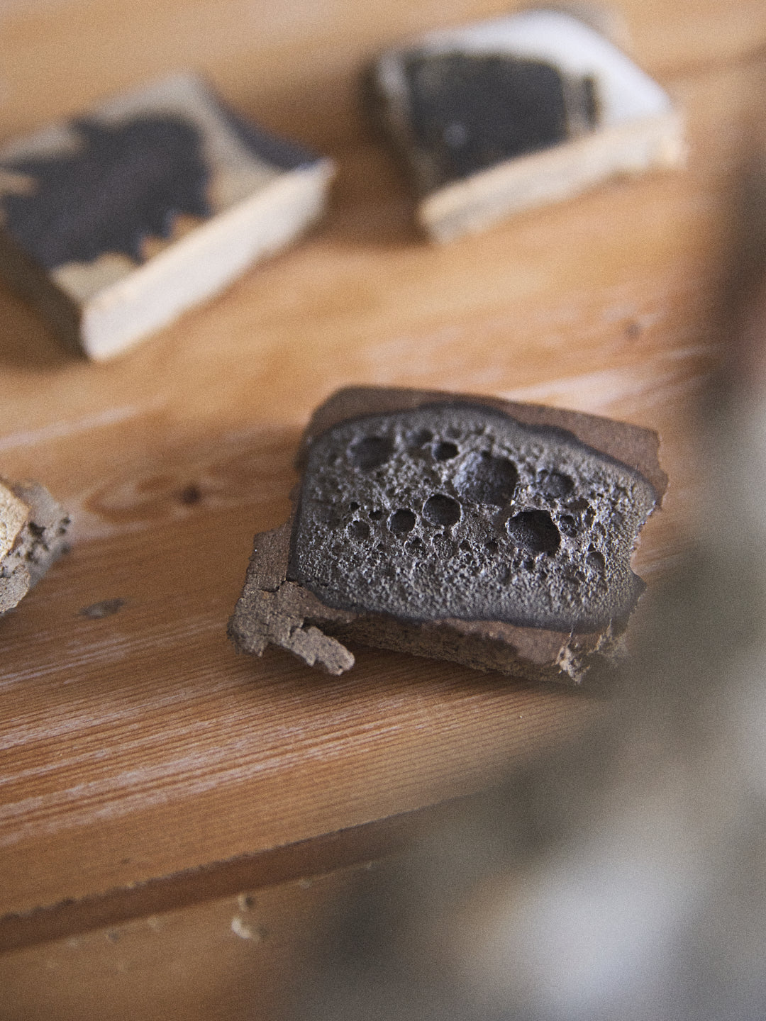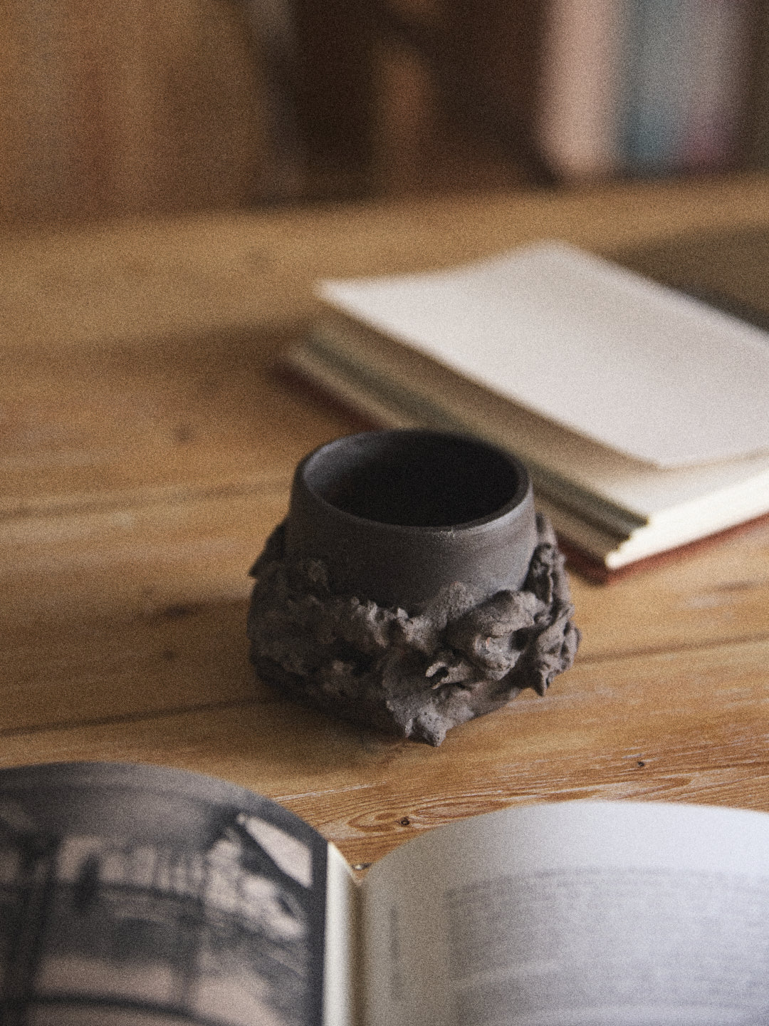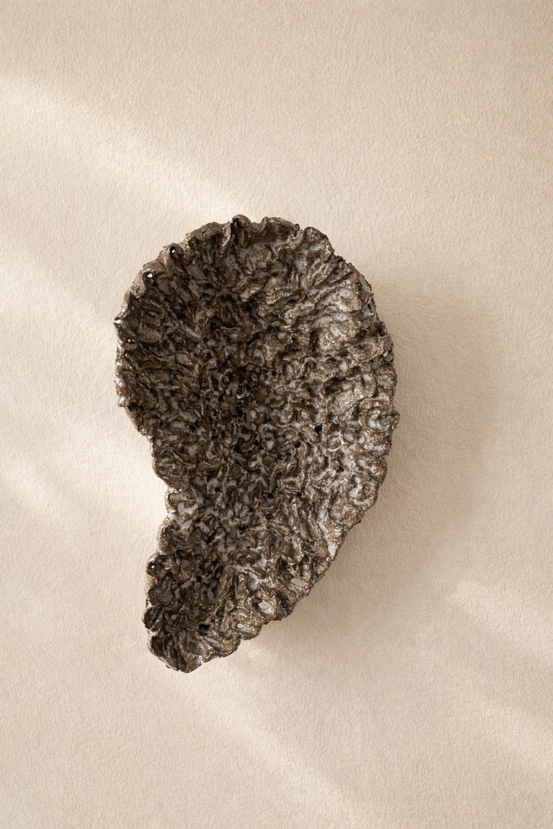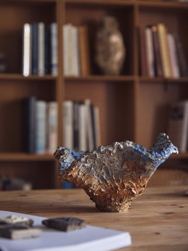 I am drawn to raw, dramatic structures — surfaces that capture the strength and intensity of the material itself. Working with oxides, clays, and natural substances, I allow the sands, grains, and minerals to remain present, unrefined, and full of energy.